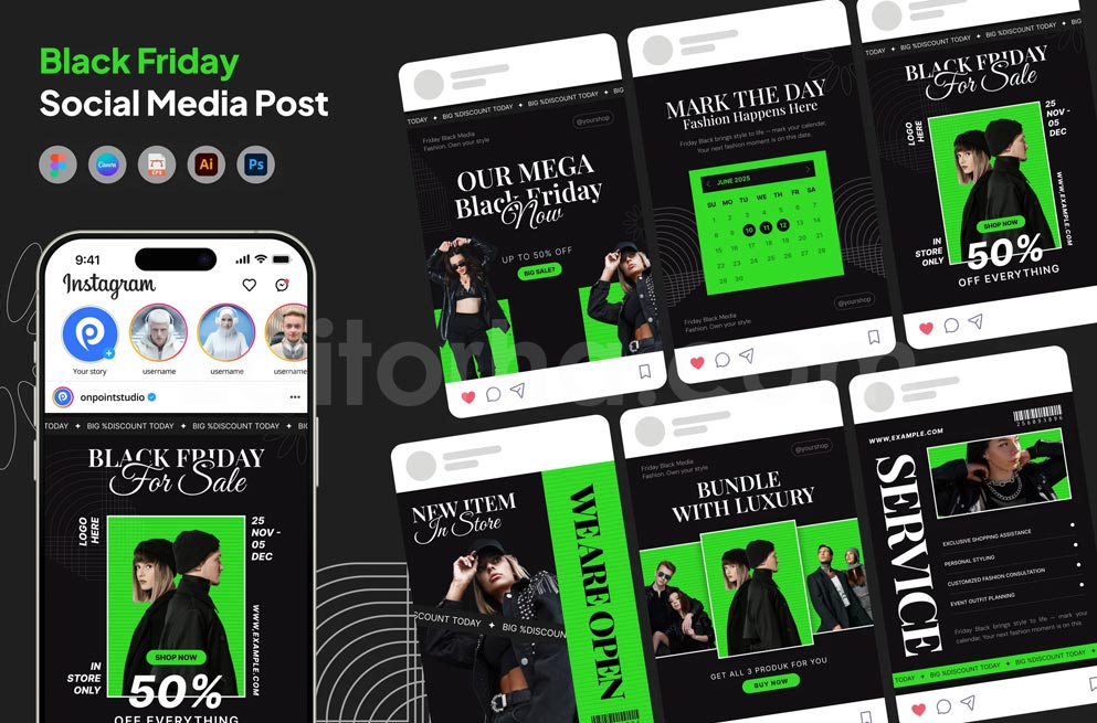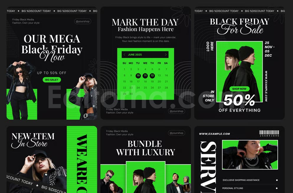 طراحی تمیز اما تاثیرگذار این مجموعه به برندها کمک میکند ظاهری حرفهای و هماهنگ با هویت بصری خود ارائه دهند. مناسب برای کسبوکارهای فروشگاهی، خدماتی و آنلاین که قصد دارند در شلوغی فروش بلک فرایدی تعامل بیشتری جذب کنند.