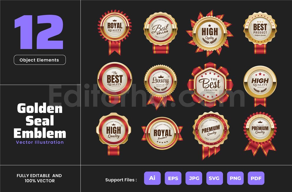 این تصویر وکتور با کیفیت بالا از نشان طلایی دایرهای لوکس با مهر طلایی و روبان قرمز، مجموعهای آموزشی عالی برای نیازهای طراحی شماست. این تصویر مناسب استفاده در پوسترها، بروشورها، بنرهای بازی، صفحات فرود، انیمیشنها، اپلیکیشنها، ارائهها و موارد دیگر است. به راحتی میتوانید رنگها را در ایلاستریتور شخصیسازی کنید.