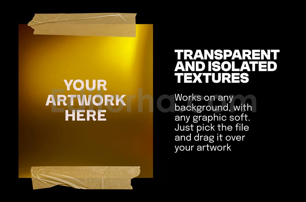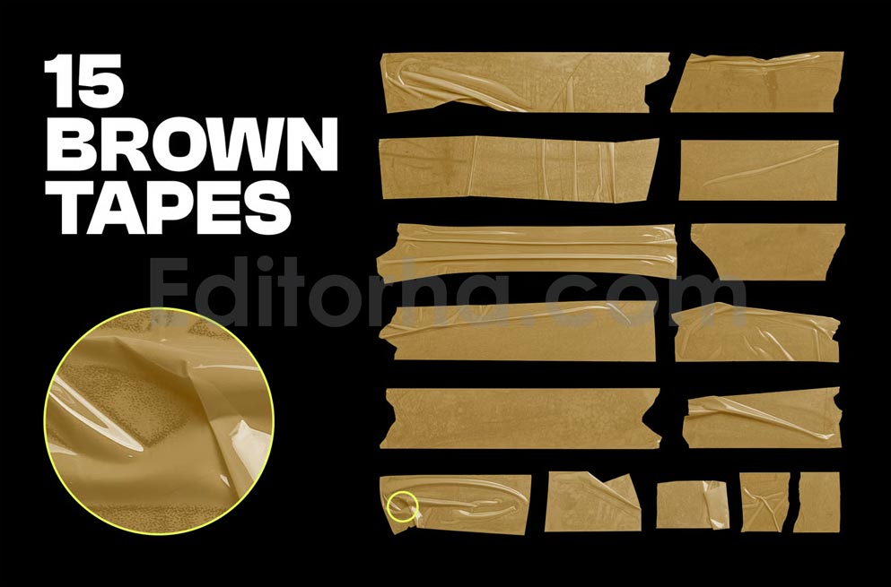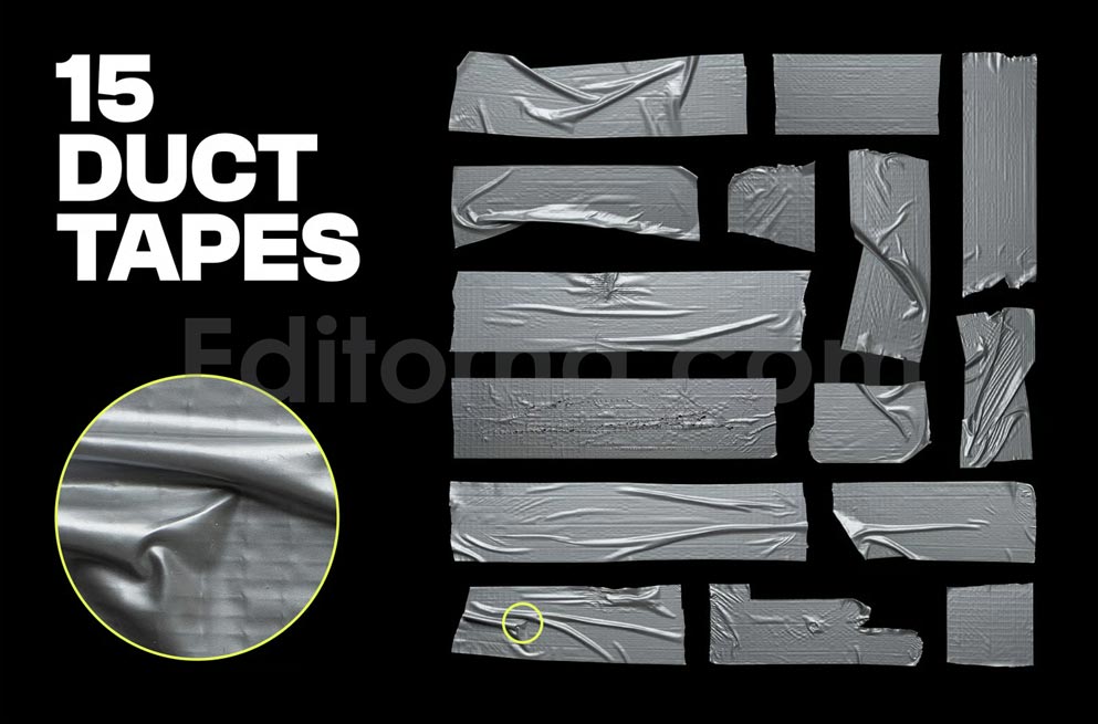 مجموعه‌ای از تکسچرهای نوار چسب پلاستیکی است. این مجموعه شامل ۱۵ تکسچر نوار چسب قهوه‌ای و ۱۵ تکسچر نوار چسب داکت (Duct Tape) می‌باشد. تمام تصاویر با فرمت PNG، با کیفیت بالا و پس‌زمینه شفاف ارائه شده‌اند؛ بنابراین می‌توانید به راحتی آن‌ها را در هر نرم‌افزار گرافیکی استفاده کنید – فقط کافیست فایل را انتخاب کرده و روی طرح خود بکشید و رها کنید.